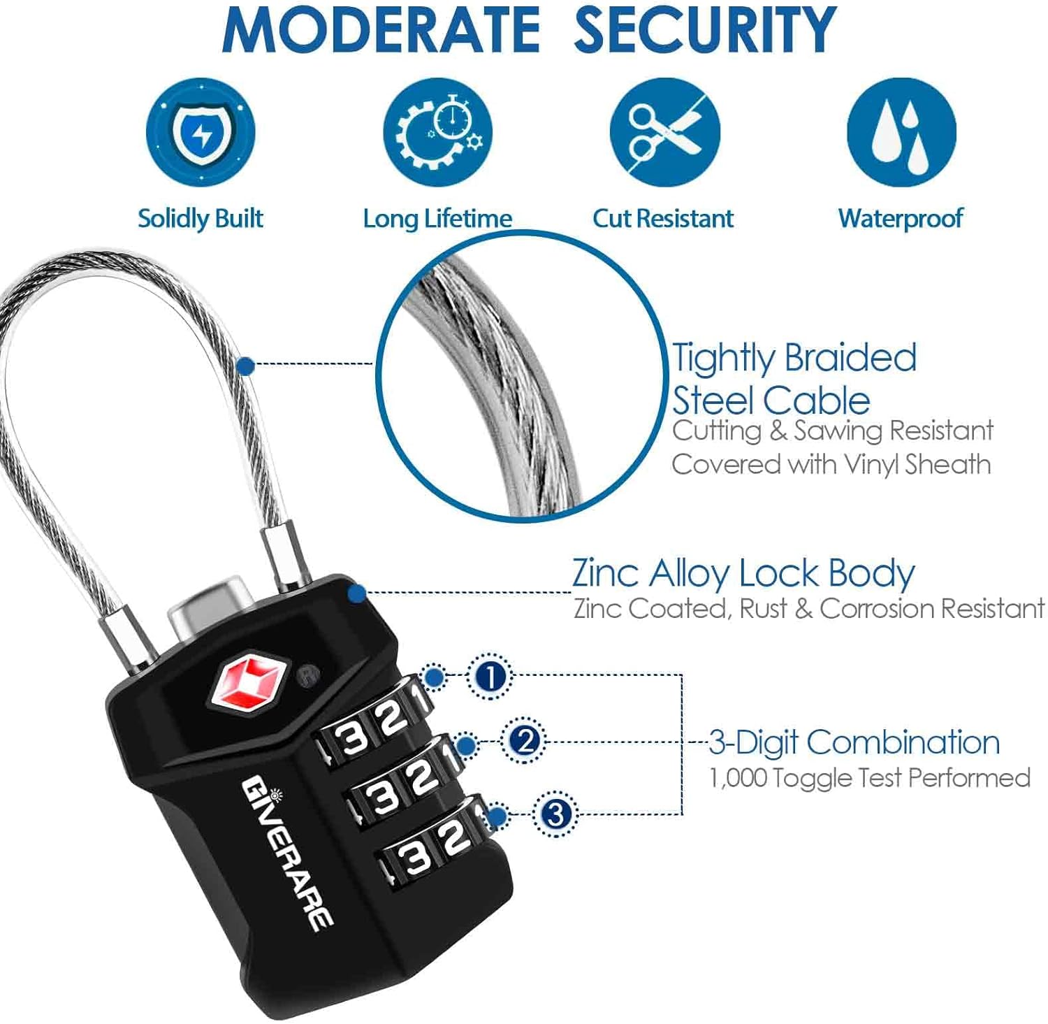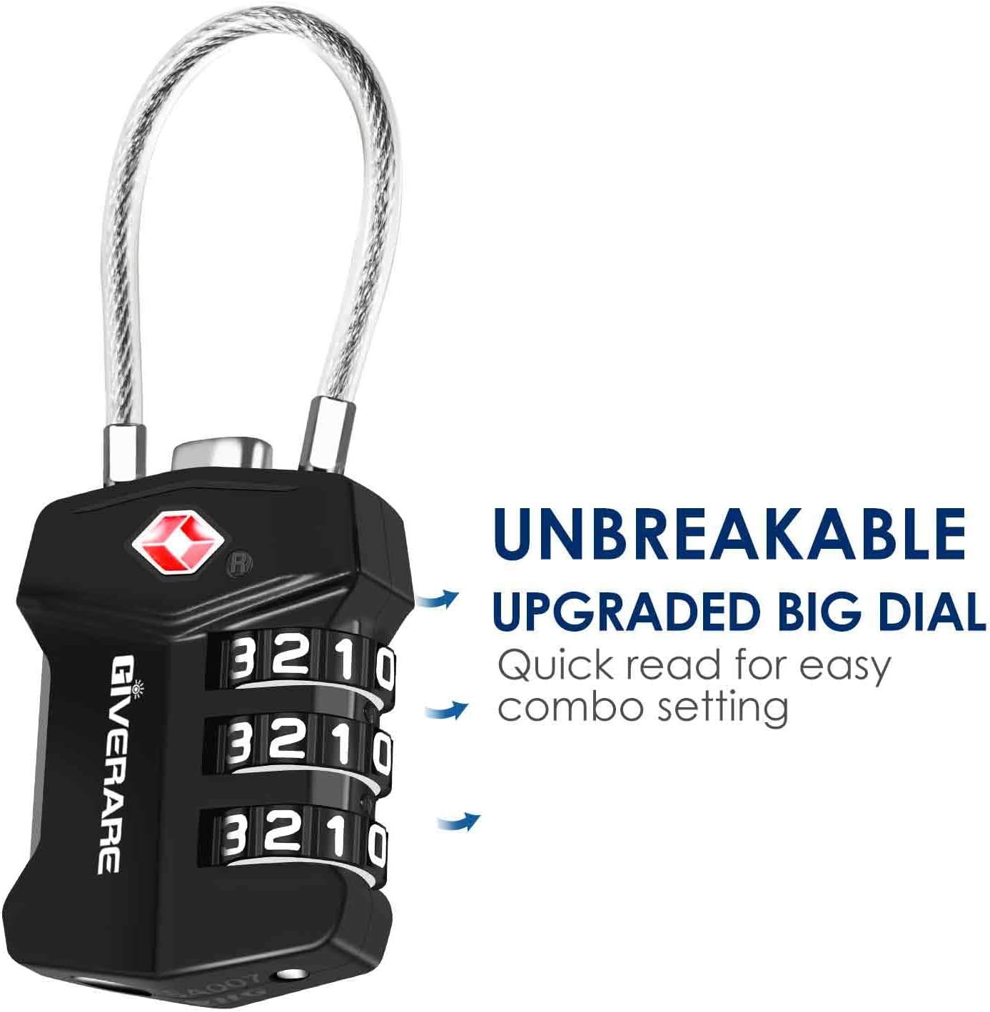 Allows TSA inspectors to inspect and re-lock baggage without damaging the lock. Help you enjoy your trip & business internationally through 750+ airports.Easy to set & read 1,000 combinations, the free twisted steel cable can be in any shapes, suitable for almost all standard sized zippers and lock holes.Carefully zinc coated zinc alloy lock body, wouldn’t rust or corrode, affords up to 220 lbs, can hardly damaged by human force.