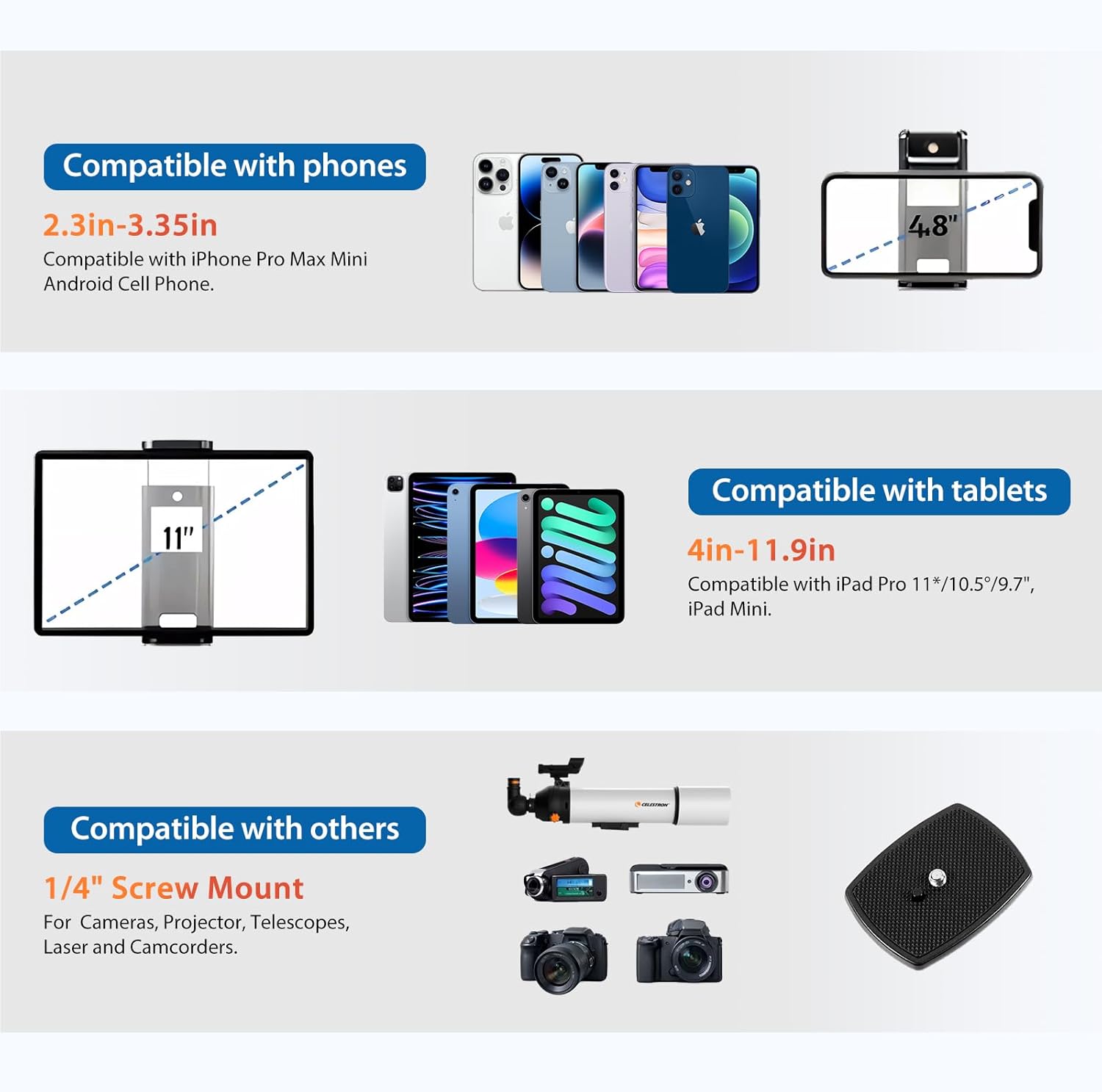 【Universal Fit for 200+ Devices】: Professional-grade 1/4″ screw ports + 360° phone/tablet clamp, compatible with DSLR (Canon/Nikon/Sony), mirrorless cameras, GoPro, webcams, projectors, and binoculars. No adapters needed—switch between iPhone 15/S23 Ultra/iPad Pro in seconds for vlogging, live streaming, or time-lapse shooting