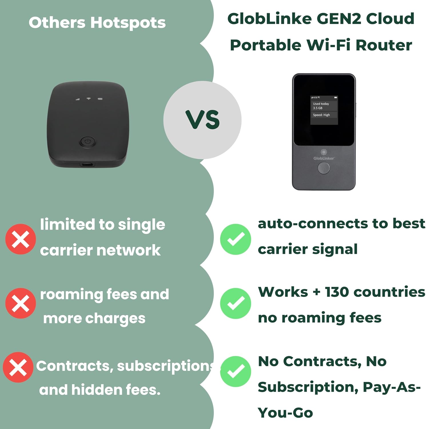 The GlobLinker Cloud Portable WiFi is a dual-band router that uses CloudSIM technology to automatically connect to the best carrier signal, providing internet access in the US and 130+ countries. With no physical SIM card needed, this compact device offers true freedom for travelers, remote workers, and those on-the-go, connect up to 8 devices. Enjoy affordable prepaid data rates valid for 7, 14, 30 days or even for 1 year validity, with no contracts or subscriptions required. The GlobLinker GEN2 Cloud Portable WiFi Router comes with 10GB of free data gifts. Experience seamless connectivity and reliable internet access with this portable WiFi router.