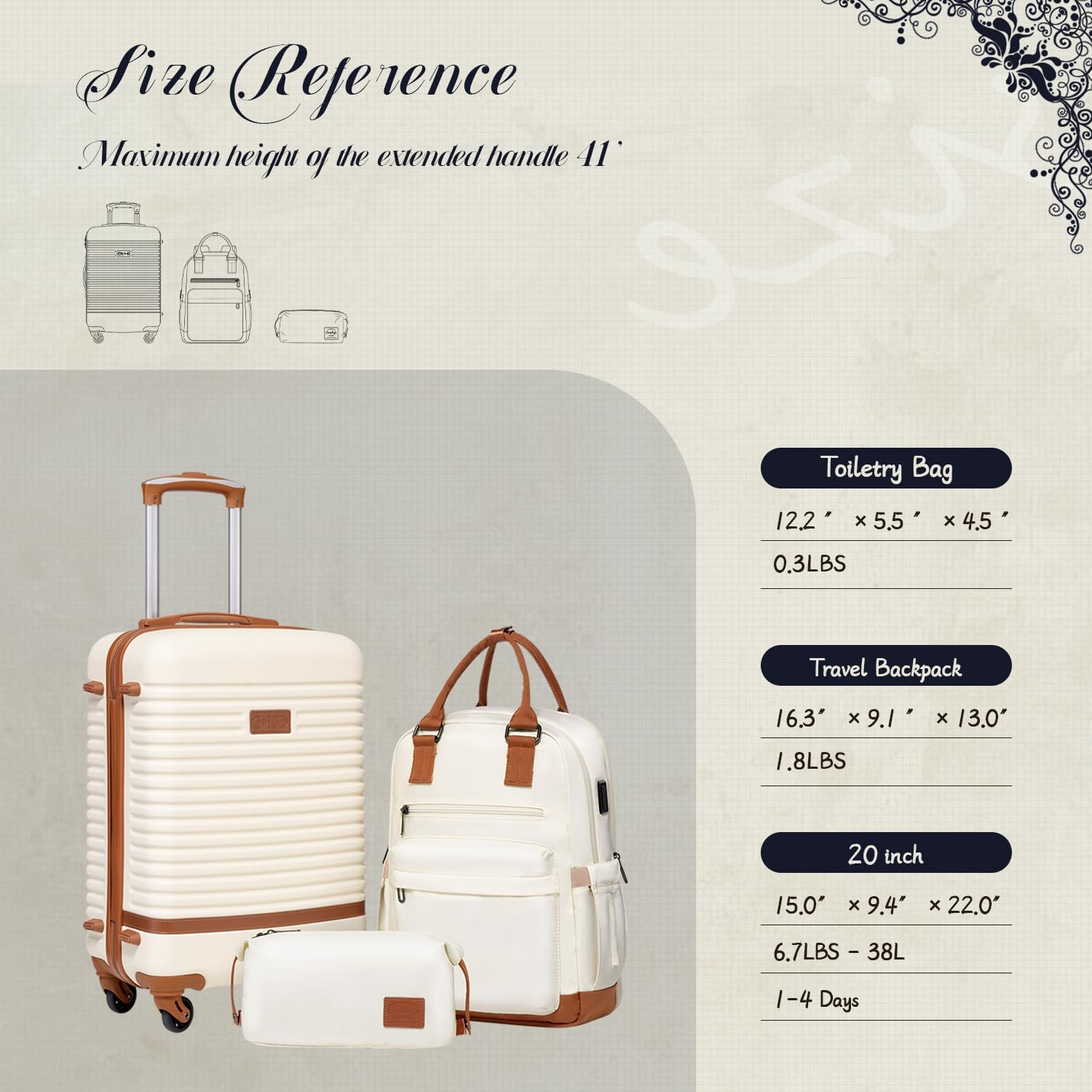Five piece set offers a 20’’ luggage, a 24’’ luggage, a 28’’ luggage, a weekender travel bag and a toiletry bag. Three piece sets offer two options. Option A includes a 20’’ luggage, a travel duffel bag and a toiletry bag. Option B includes a 20’’ luggage, a backpack and a toiletry bag.