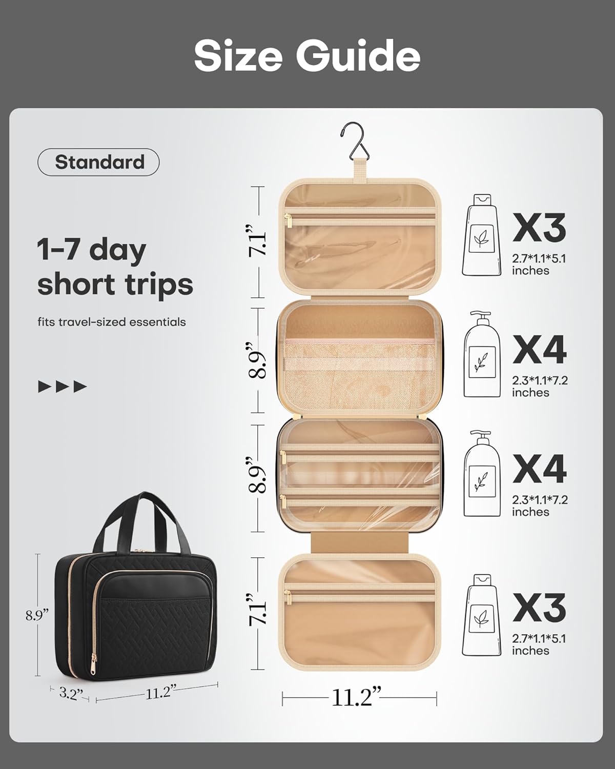 SIZE GUIDE FOR EVERY TRIP: Choose the perfect size to match your travel needs. The standard cosmetic travel bag is ideal for 1-7 day trips, perfectly fitting travel-size essentials. For longer adventures, the large one accommodates 2-3 weeks’worth of full-sized toiletries. The HOTOR travel bag for toiletries ensures you have everything you need, no matter the journey.