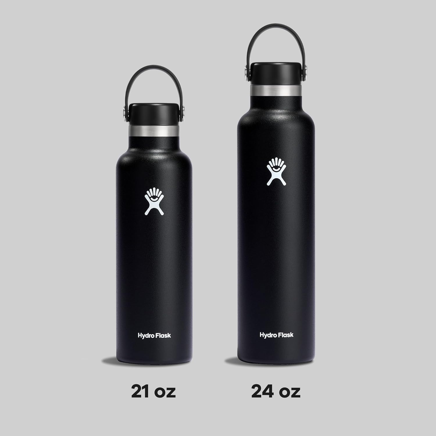 24 OZ BLACK BOTTLE: Fill and refill with the Hydro Flask Standard Mouth insulated water bottle with leakproof cap. With a comfortable, flexible handle, the bottle is easy to grab and take anywhere. Double-wall insulation keeps drinks cold up to 24 hours and hot for 12.