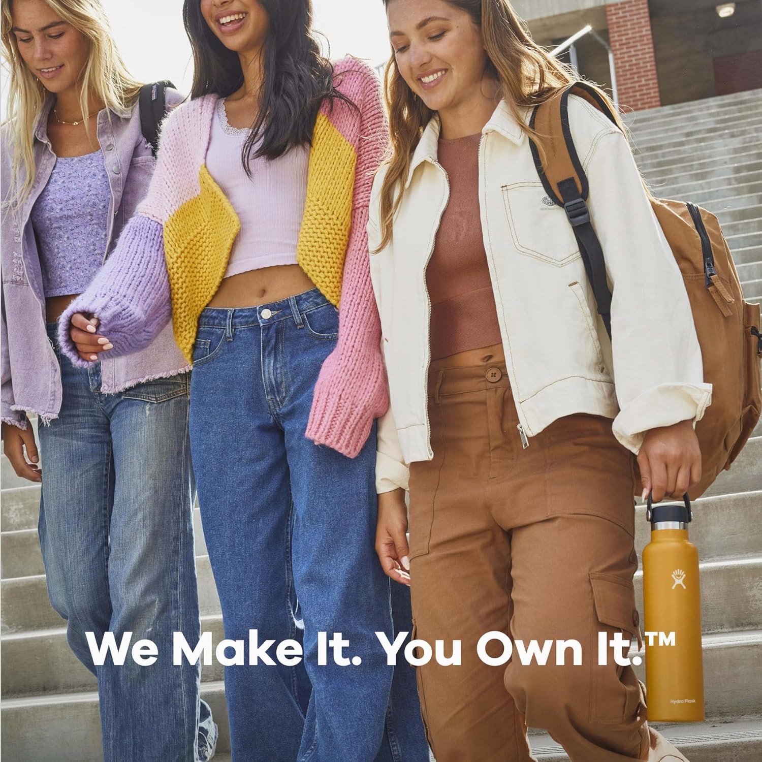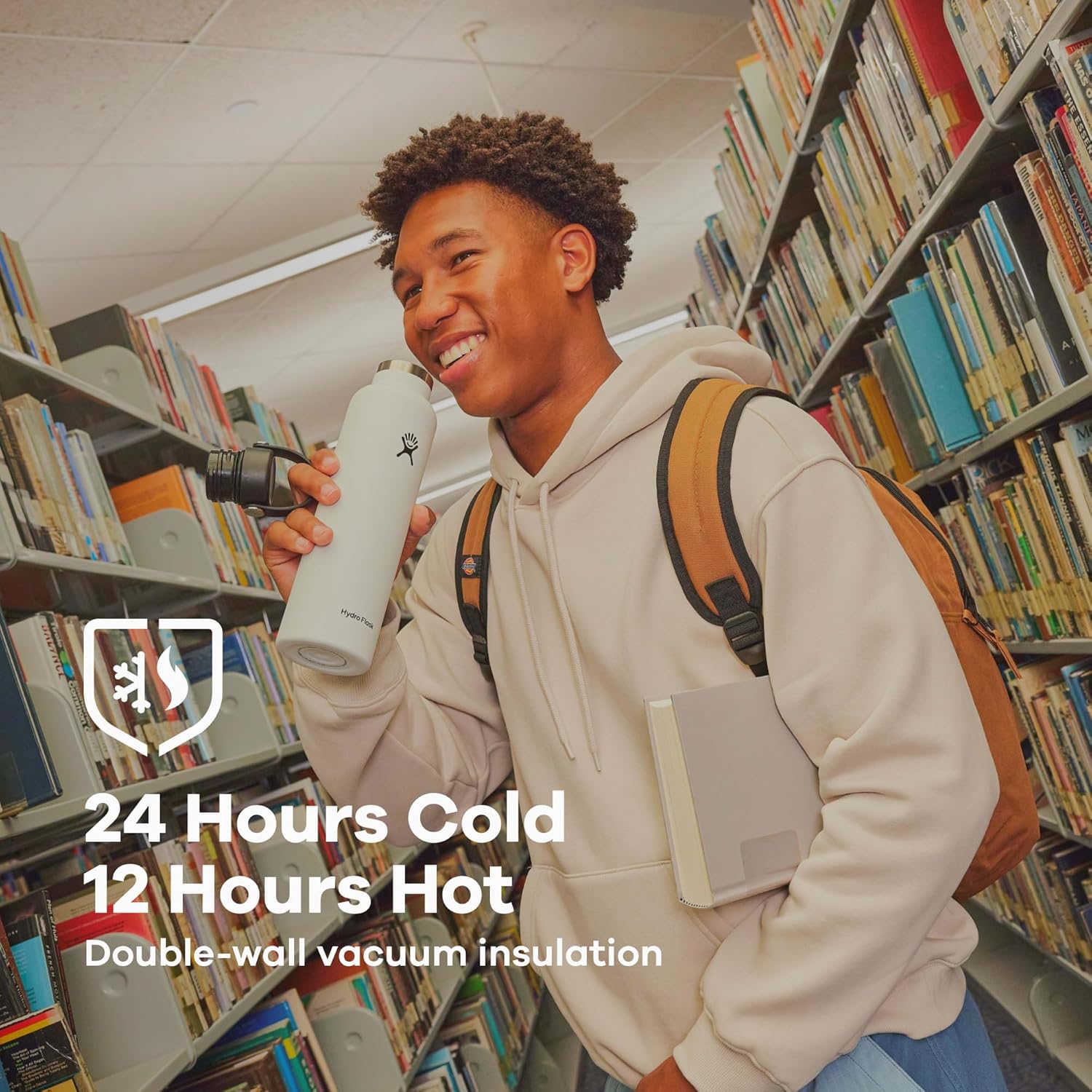 Stay hydrated with the Hydro Flask 24 oz Standard Mouth Bottle. With a comfortable, flexible handle, the reusable water bottle is leakproof with double-wall insulation to keep drinks cold up to 24 hours and hot for up to 12 hours. The insulated bottle easily fits ice cubes and is dishwasher safe. 24 hours cold. 12 hours hot. TempShield® double-wall vacuum insulation. Leakproof when closed. Won’t retain odor or leftover flavor. BPA-Free. Dishwasher safe. Easy to clean by hand or dishwasher. Stays clean and colorful. Not for use on a stove, in a microwave or freezer. Keep hot drinks out of the reach of children. Bottle fits all Standard Mouth caps and lids, including the leakproof Flex Straw Cap.