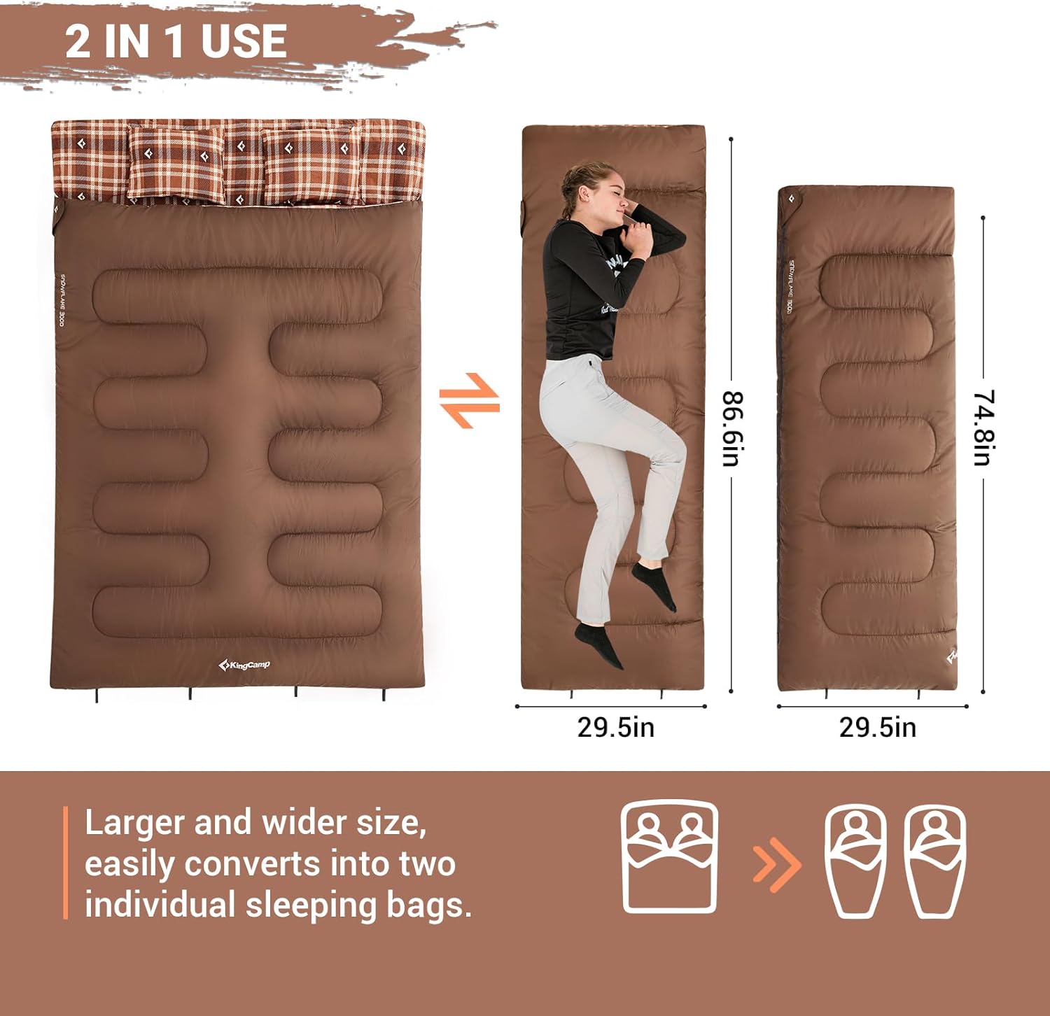 LARGER THAN QUEEN SIZE: At 87″ x 59″, our double sleeping bag is 6 inches wider than most, providing extra space for adults up to 7ft tall. Perfect for those who prioritize comfort and need more room for a relaxing sleep. Ideal for couples, families with kids, or anyone looking for extra comfort during outdoor adventures.