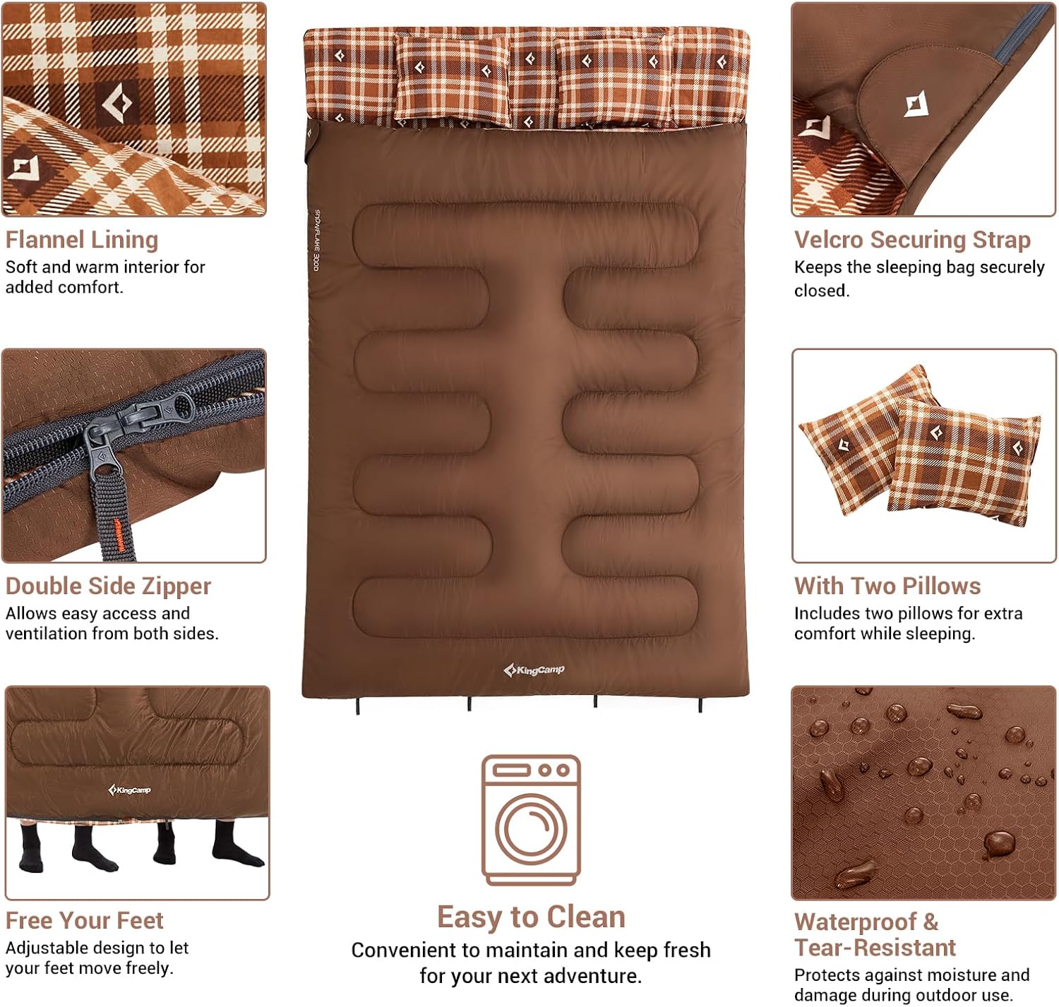 SUPER COMFORTABLE AND SO WARM: Enjoy warmth like never before with our flannel cotton lining and premium hollow fiber fill. The soft, breathable materials offer excellent insulation, ensuring you stay cozy in cooler weather. With extra-thick design, our 2 person sleeping bag minimizes heat loss, keeping you comfortable and warm for an uninterrupted sleep.