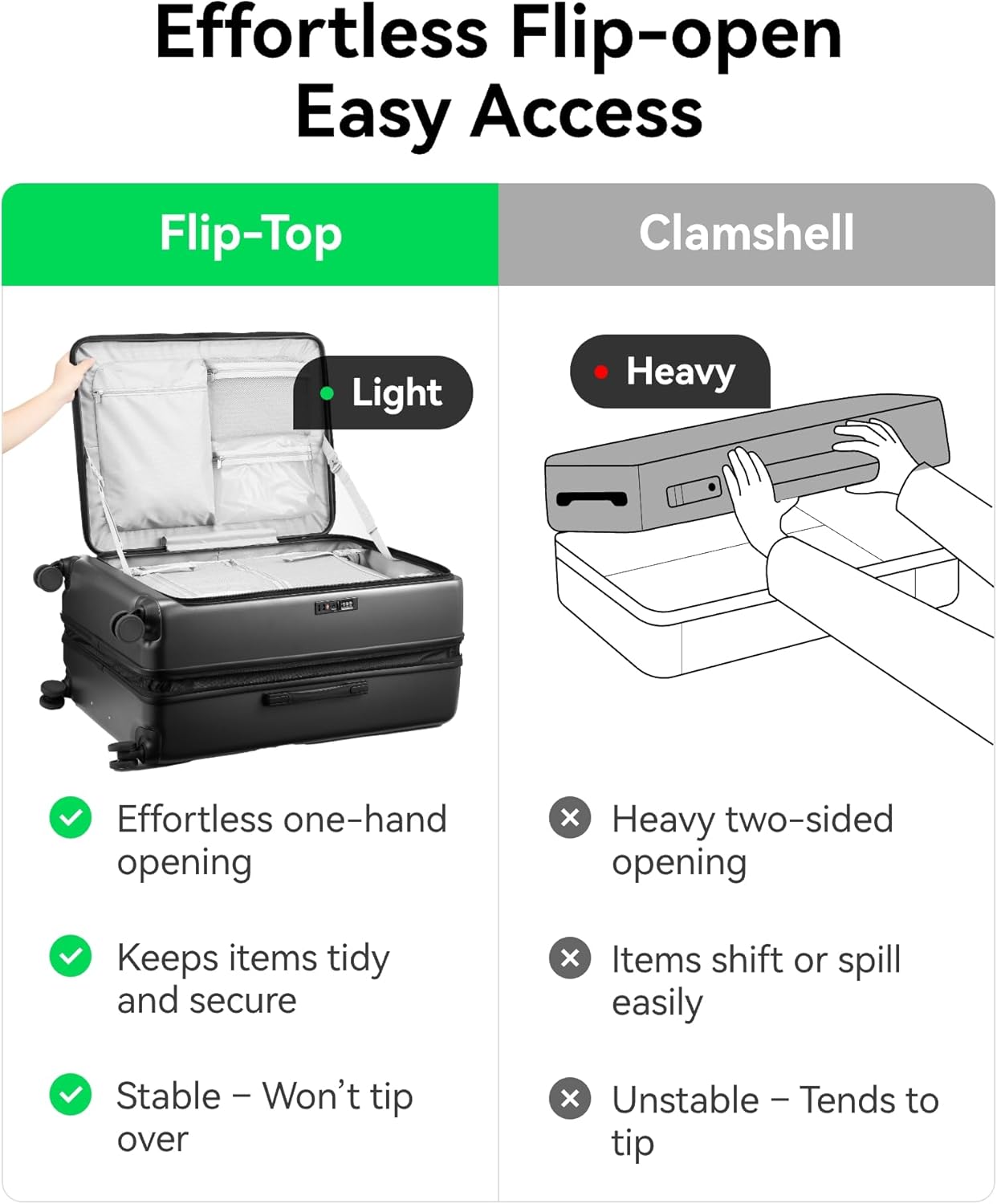 Front-Opening Design: Our checked luggage features a convenient front-opening design, allowing easy access to your belongings without having to rummage through your suitcase. Effortlessly open and close your luggage, making packing and unpacking a breeze.