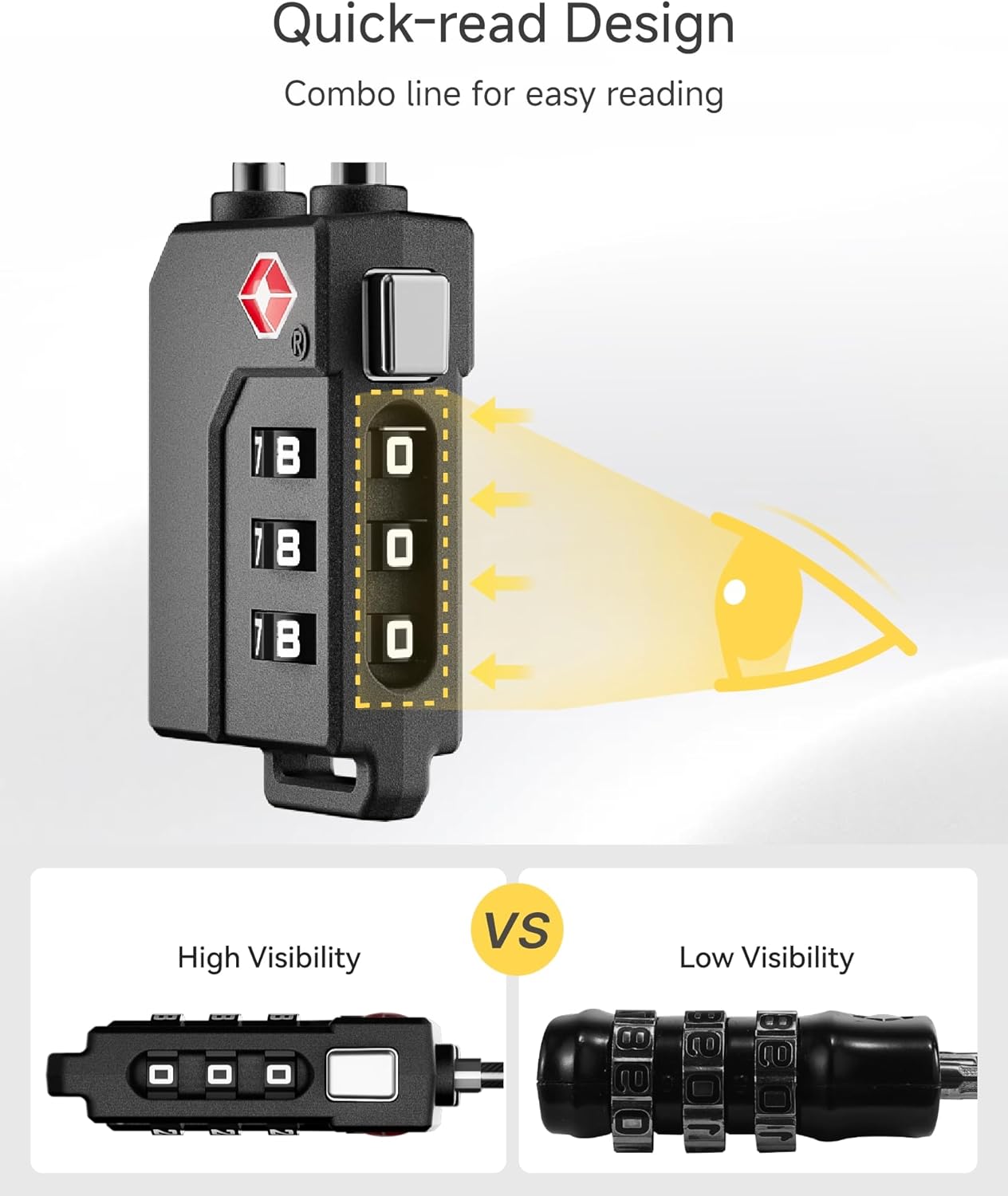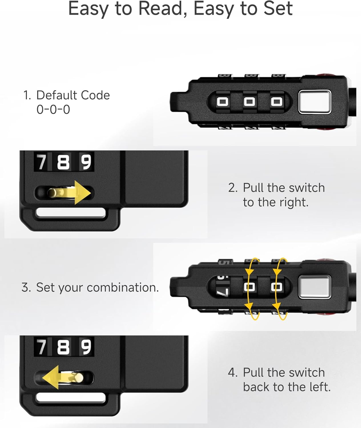 【Set Light, Read Bright】Easily set your own 3-digit code with a simple flick of a switch in seconds!The high-contrast dials make combo changes a breeze, even in dim airplane cabins – no eyestrain!