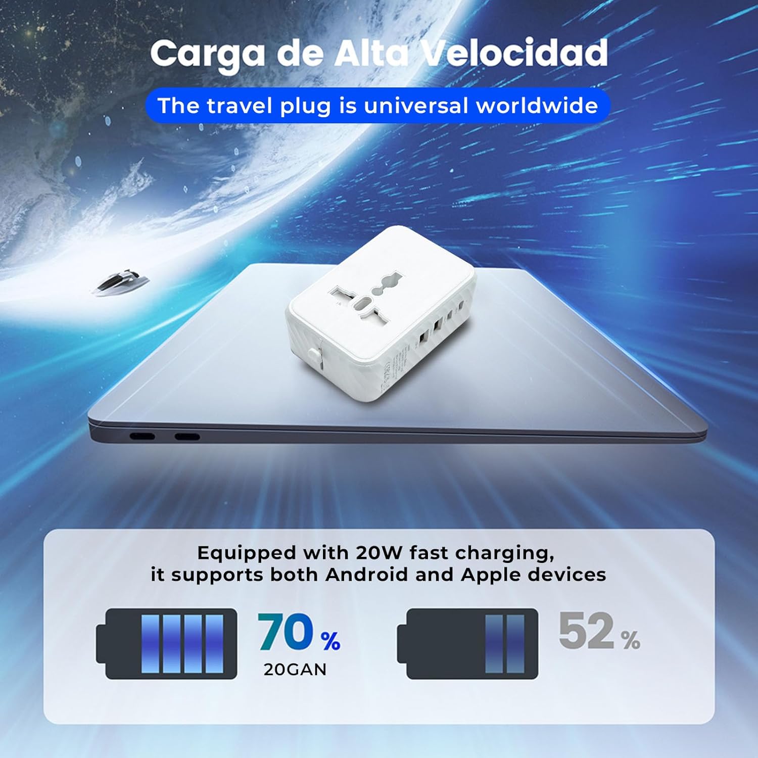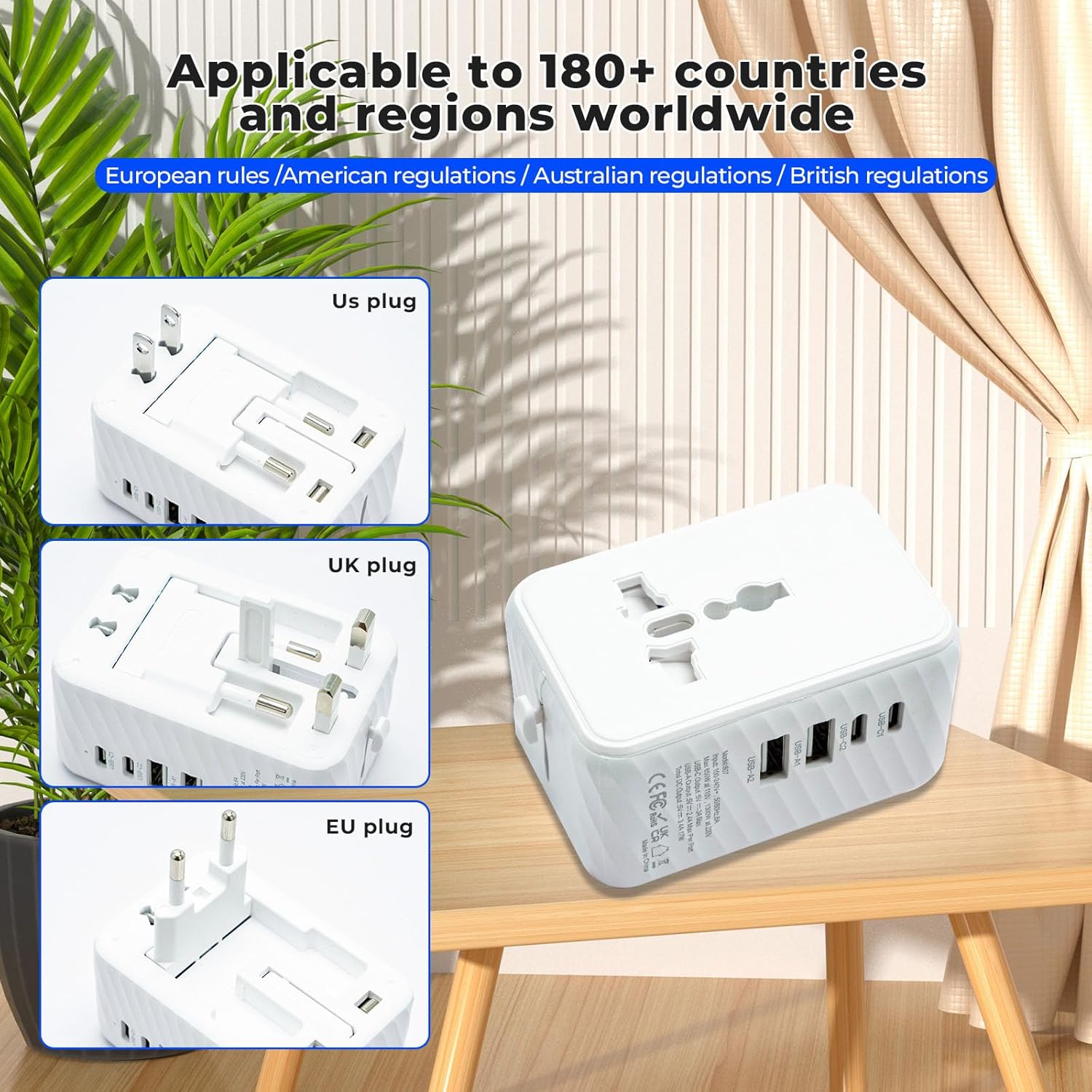 Travel Anywhere: One Plug, 180+ Countries Includes 4 plug types, US, EU, UK, and AU standards.