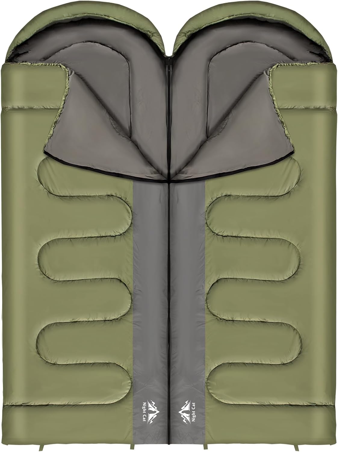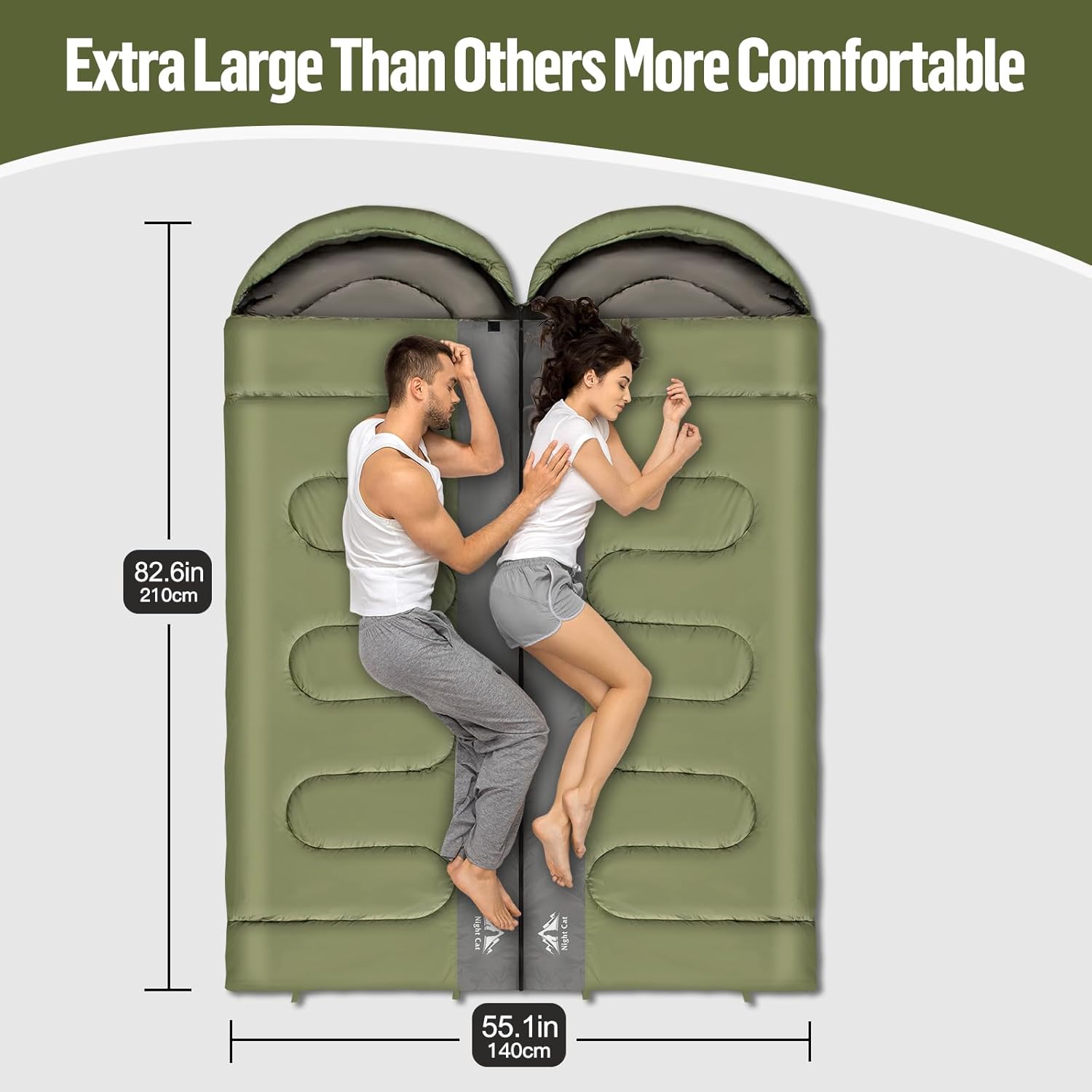 【Compact & Portable】The double sleeping bag comes with a compression sack featuring a drawstring and straps for powerful compression, allowing for super convenient storage and easy carrying.The two person sleeping bag is specifically engineered to compress tightly for easy packing but puffs up nicely when in use.