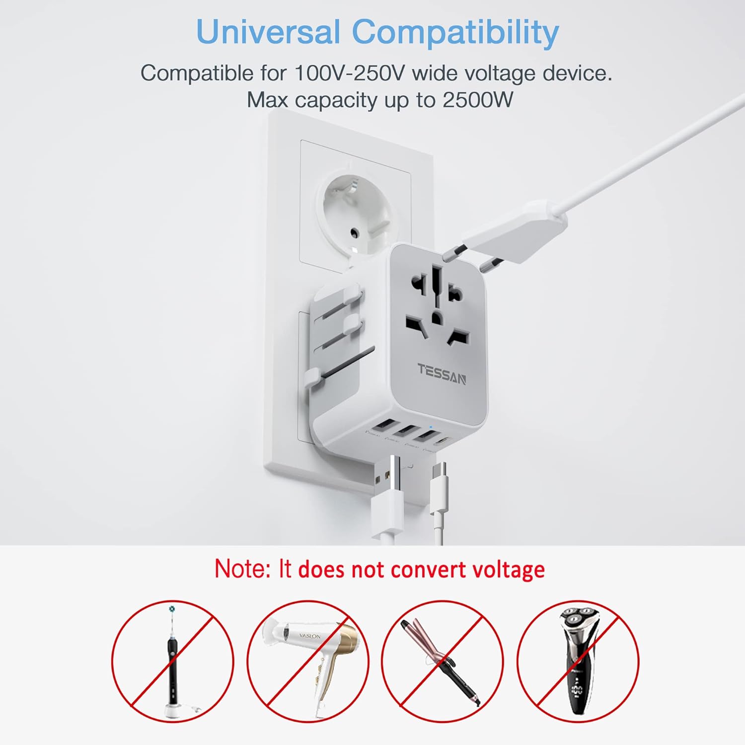 Versatile Plug: TESSAN universal travel adapter can converts plug from US, EU, AU, UK to Type A plug, you can plug electronics from different countries (except India and South Africa) into the power outlet in USA. (Note: This is not a voltage converter, only compatible for 100V to 250V wide voltage device)