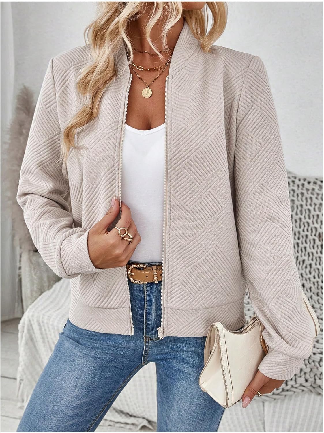 Verdusa Women’s Zip Up Textured Lightweight Bomber Jacket Casual Long Sleeve Outerwear